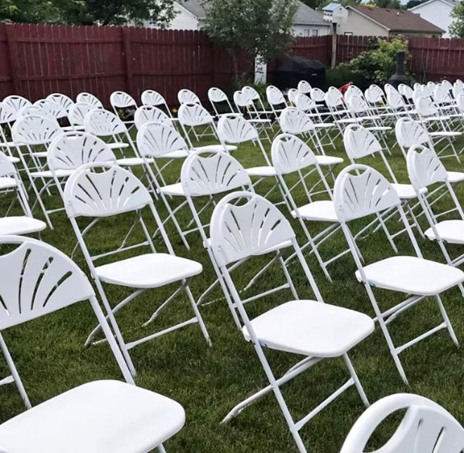 Folding chairs available in black or white. Clean, comfortable seating for your guests at any event. Order as many as you need.